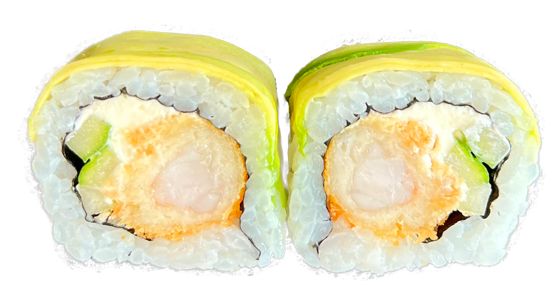 2 Stk. -mit Tempura frittierte Black Tiger Garnelen, Gurke, Frischkäse, ummantelt (außen) mit Avocado