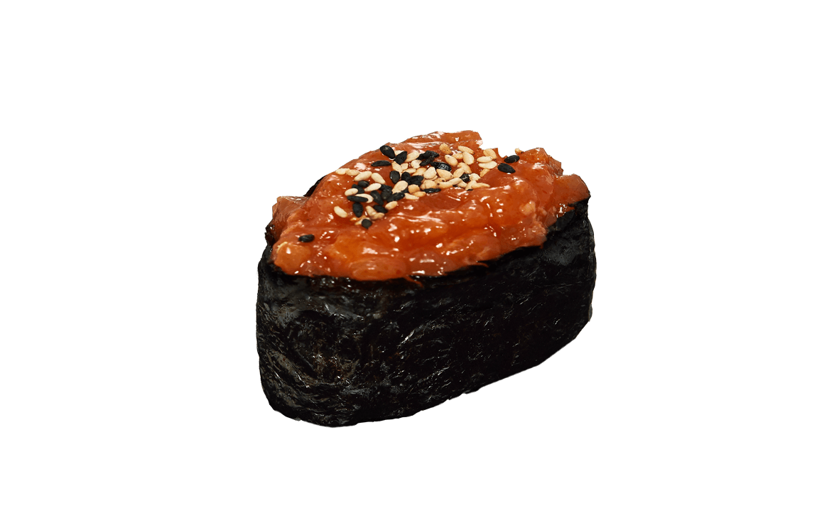Pikantes Lachstatar auf Reis umhüllt von einem Noriblatt, 1 Stk.