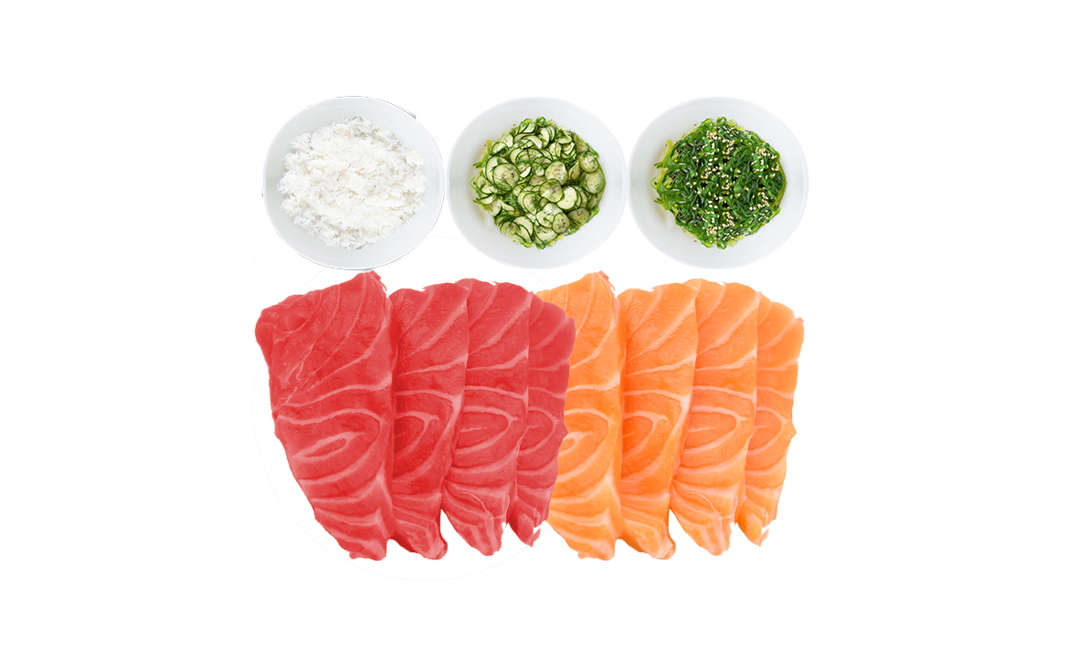 4 Thunfischfiletscheiben, 4 Lachsfiletscheiben mit Portion Reis, Algensalat und Gurken. Sojasauce, Wasabi, Ingwer und Stäbchen mitgeliefert.